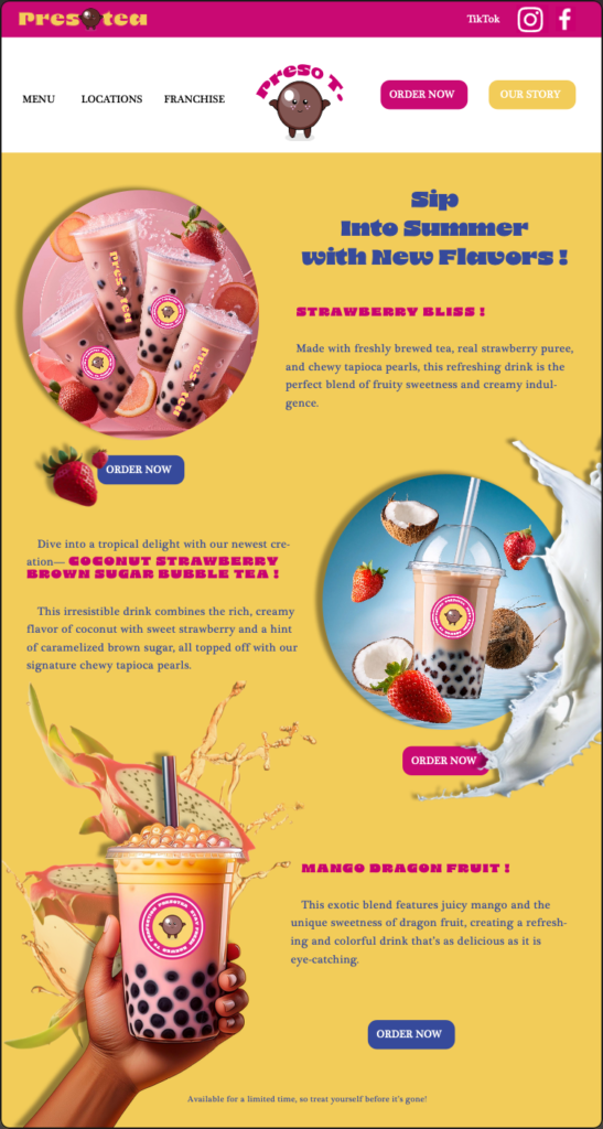For this project, I reimagined the branding of Preso Tea, a bubble tea shop, focusing on creating a joyful and inviting look. I designed a new logo featuring vibrant colors and a cute mascot, capturing the fun and playful spirit of bubble tea. Alongside the logo, I developed a one-page e-newsletter in InDesign that includes interactive elements like hyperlinks and social media icons. The layout is organized to highlight the shop’s unique offerings while maintaining a lively, engaging aesthetic that reflects the brand’s upbeat vibe.